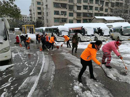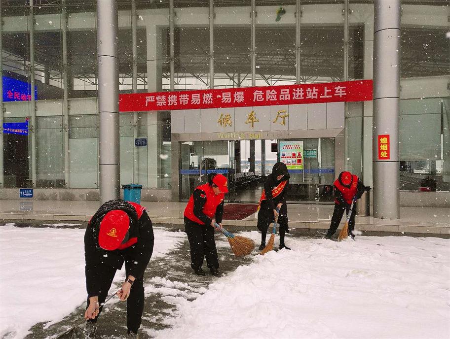 工作人員與志愿者一起清掃積雪,做好站場防滑措施(汽車南站)