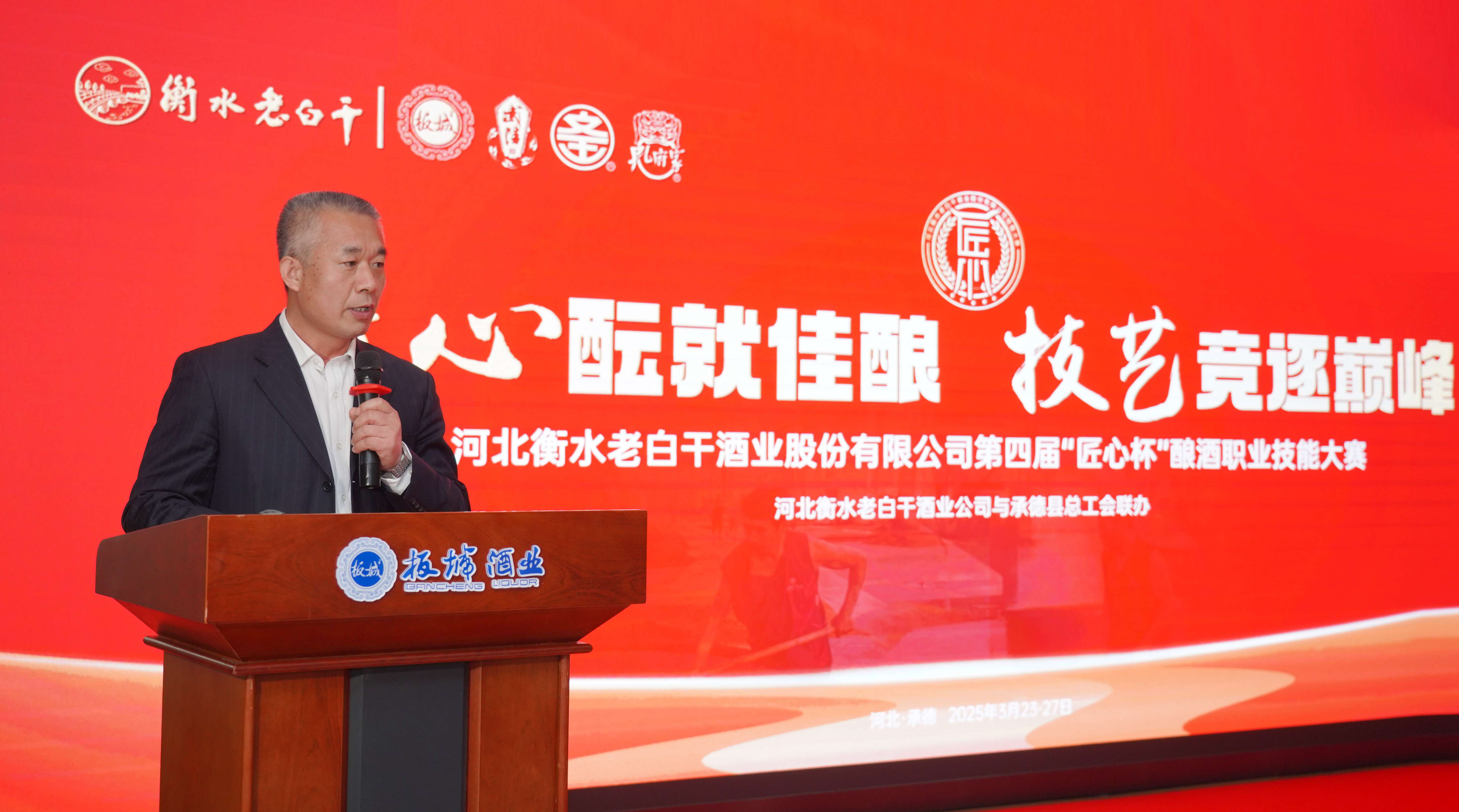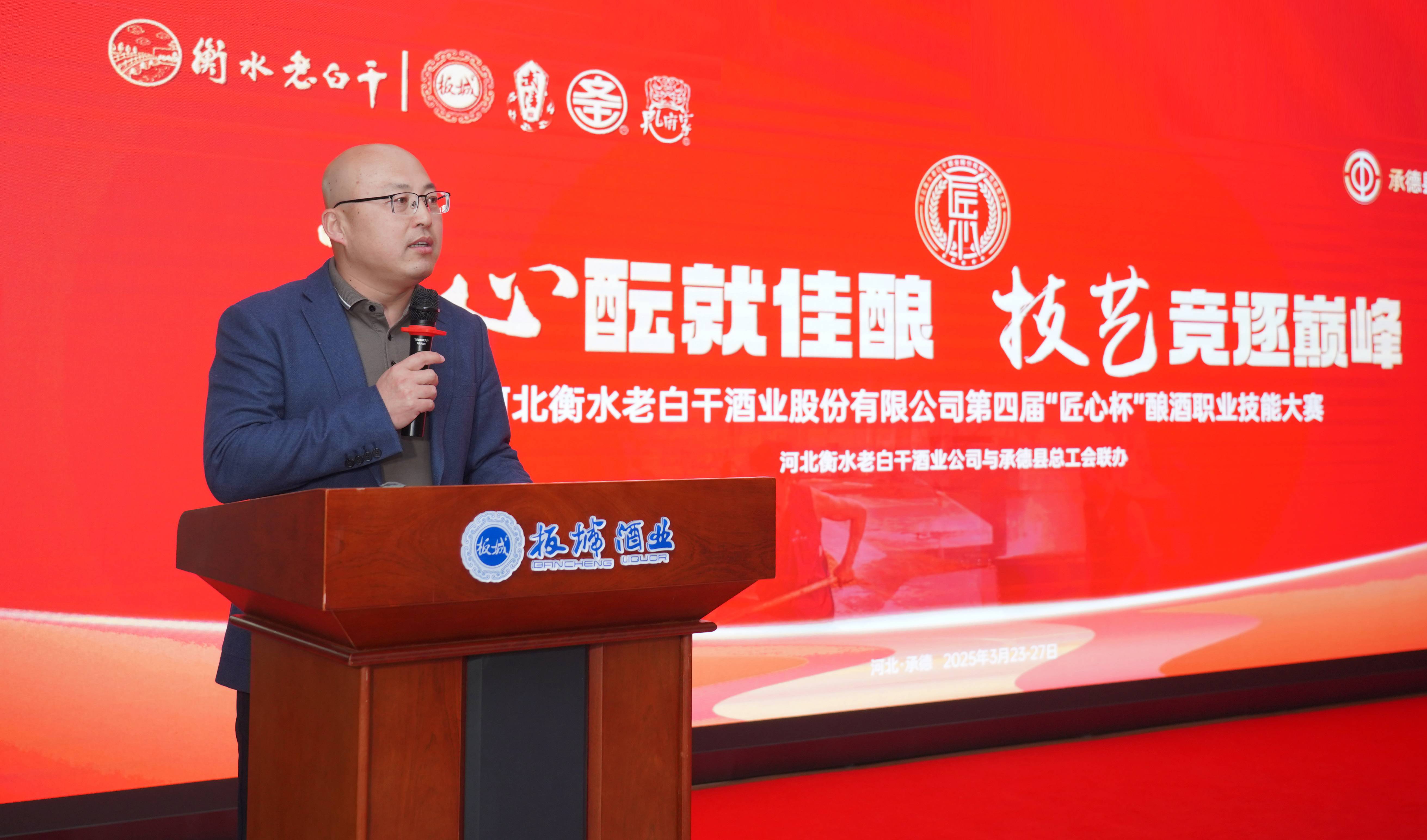 承德縣總工會黨組書記、常務副主席溫明忠在活動中致辭,他講到:“此次‘匠心杯’釀酒職業(yè)技能大賽,是老白干酒業(yè)集團為旗下五家酒業(yè)公司的‘技能大師’們搭建的切磋技藝、展示風采、傳承精神的廣闊舞臺。每一位參賽選手都是各自企業(yè)的佼佼者,他們帶來的不僅是精湛的釀酒技藝,更是對釀酒事業(yè)的無限熱愛與執(zhí)著追求。通過這場比賽,大家相互學習、相互交流,在競爭中進步,在切磋中成長,必將推動酒行業(yè)整體水平的大幅提升。希望以此次大賽為新的起點,進一步弘揚工匠精神,加強技術創(chuàng)新與研發(fā),為消費者釀造出更高品質的美酒,為中國酒業(yè)的發(fā)展注入新的活力。”