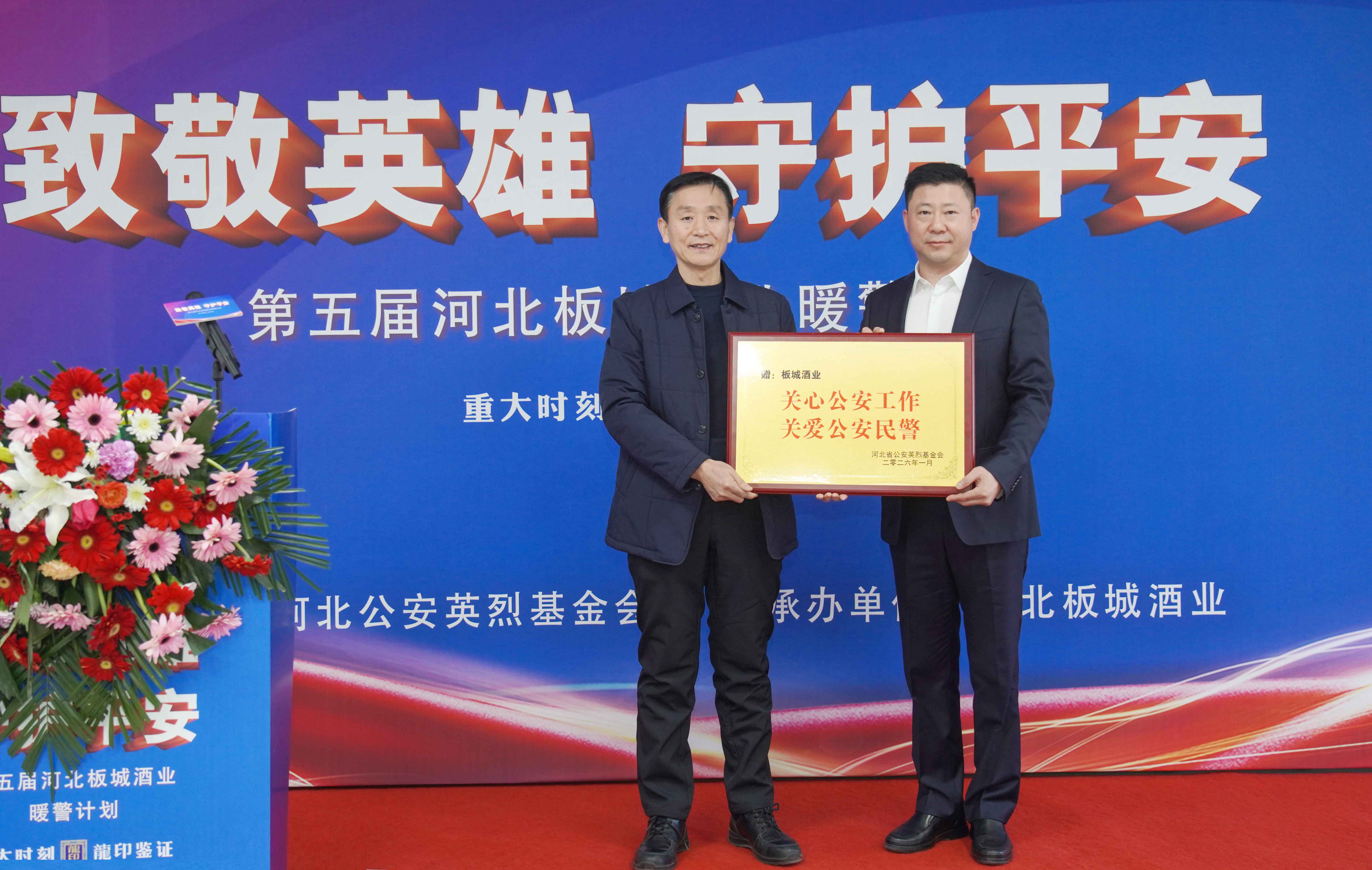 河北省公安英烈基金會(huì)副理事長(zhǎng)崔際尚向板城酒業(yè)授予愛(ài)心企業(yè)牌匾。